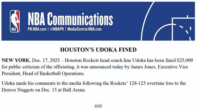 北京时间12月18日,NBA官方公布罚单,休斯顿火箭队主教练乌度卡因在周二球队加时惜败丹佛掘金队后公开抨击裁判判罚,被联盟处以25000美元罚款。
