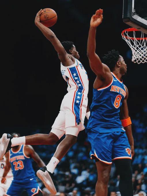 雷速体育10月5日讯 NBA季前赛,76人对阵尼克斯的比赛中。第一节比赛,埃奇库姆接球加速突破,直接起飞完成单臂劈扣。