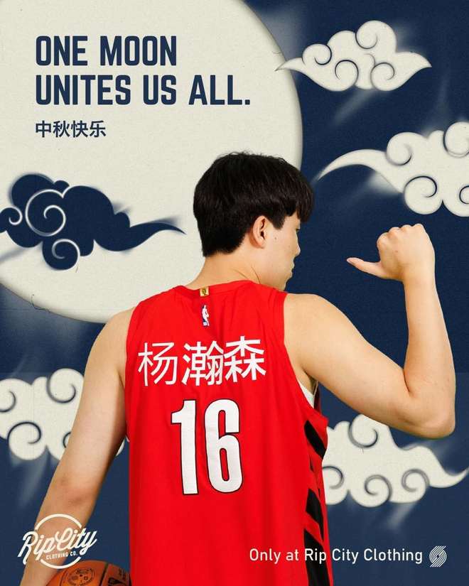 开拓者官方送上中秋祝福,并宣布推出杨瀚森中文版球衣